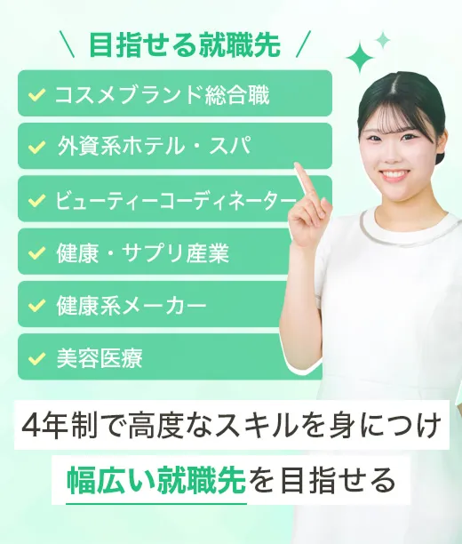 エステ・コスメを広く、深く学ぶとともに、美容・健康+マネジメントを身につけ、 起業や美容業界で