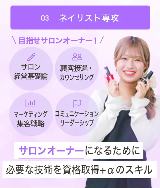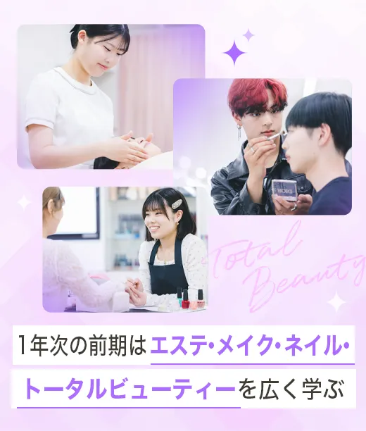 経験豊かなプロが最新トレンドや高い技術力を伝授。 お客様の「トータルビューティー」を叶えるために、 就職はもちろん独立開業もめざせる人材を育成します。